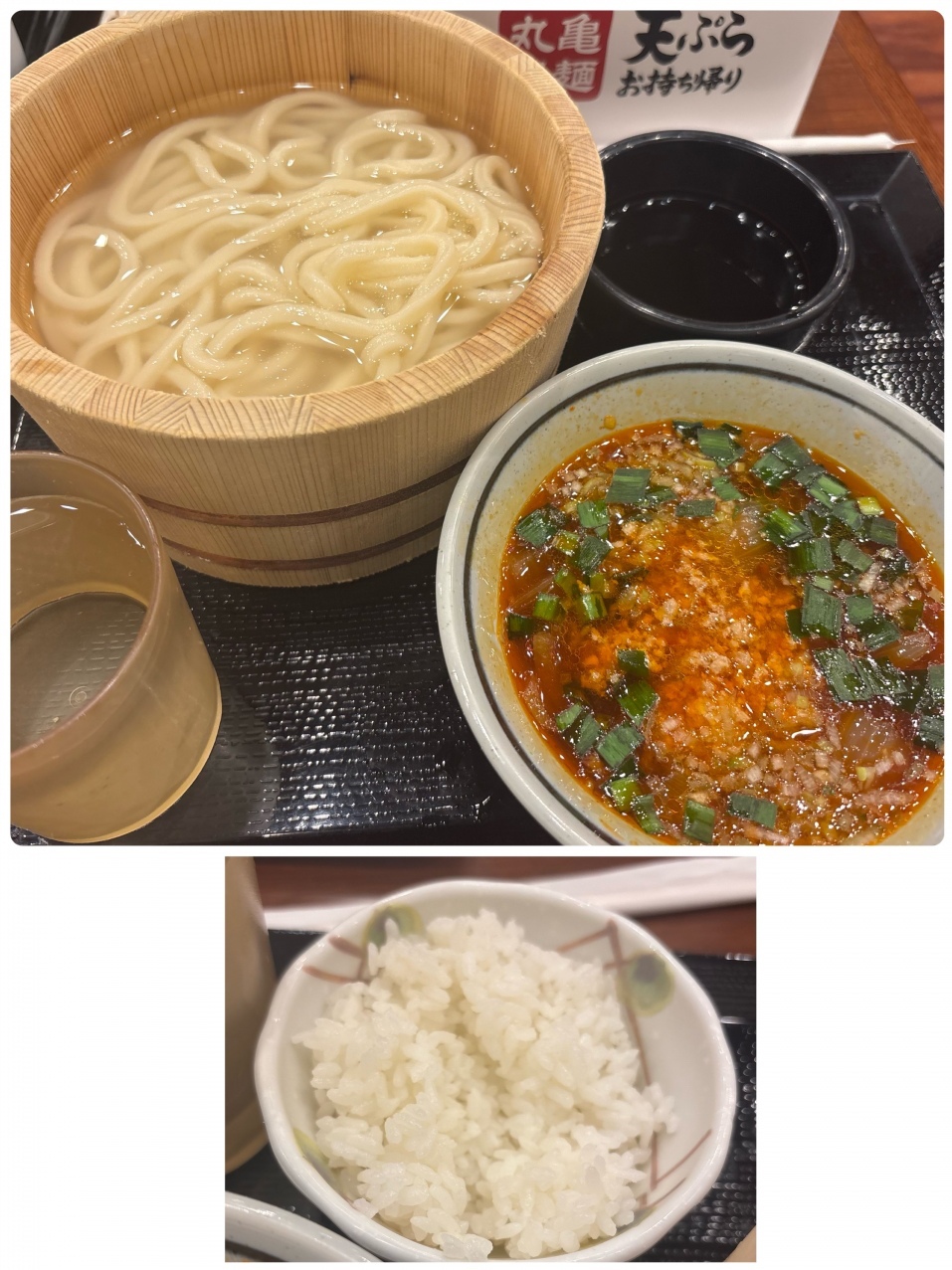丸亀 今日は... 1日。釜揚げうどんが半額の日♪と⋯数量限定で『季節のつけ汁』が販売されているのを知ってますか?meは知らなくて...昨日、初めて知りました!で、今月は⋯『旨辛肉ラー油つけ汁(ひと口ごはん付)』。美味しそうー 😋という事で、本日。初参戦して来たYo♪お会計に登録がなくかなり待たされたり...ひと口ごはん🍚が出てこなかったり...と、グダグダだったけど...うどんも、つけ汁も美味しゅうございますた😋